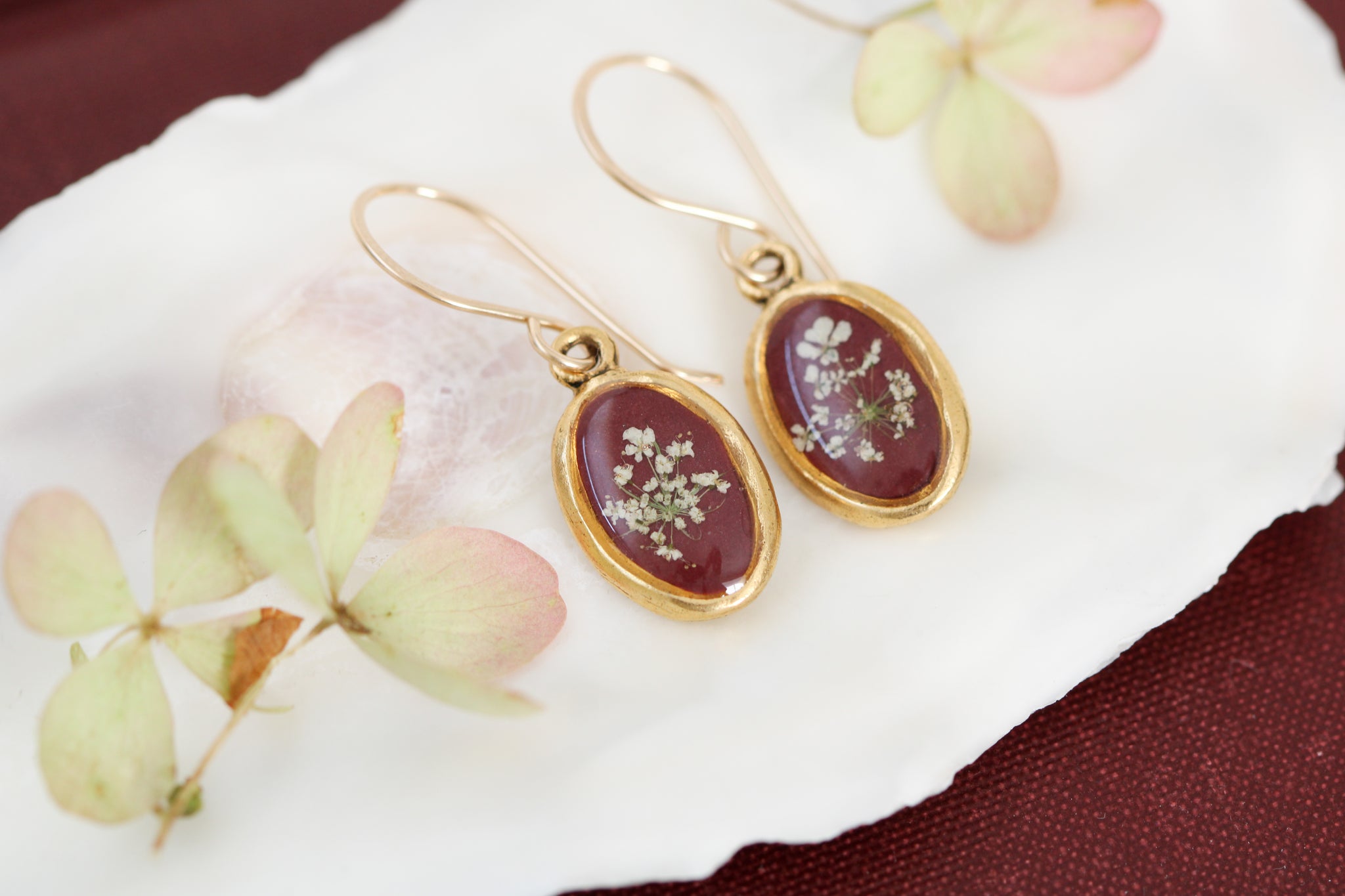 Elevate your elegance with these Burgundy Gold Oval Earrings, featuring delicate Queen Anne's Lace artfully preserved in resin and clay. Each pair is crafted with attention to detail and finished with handmade gold-filled ear wires, ensuring both luxury and lasting comfort. Perfect for adding a refined floral touch to any outfit.