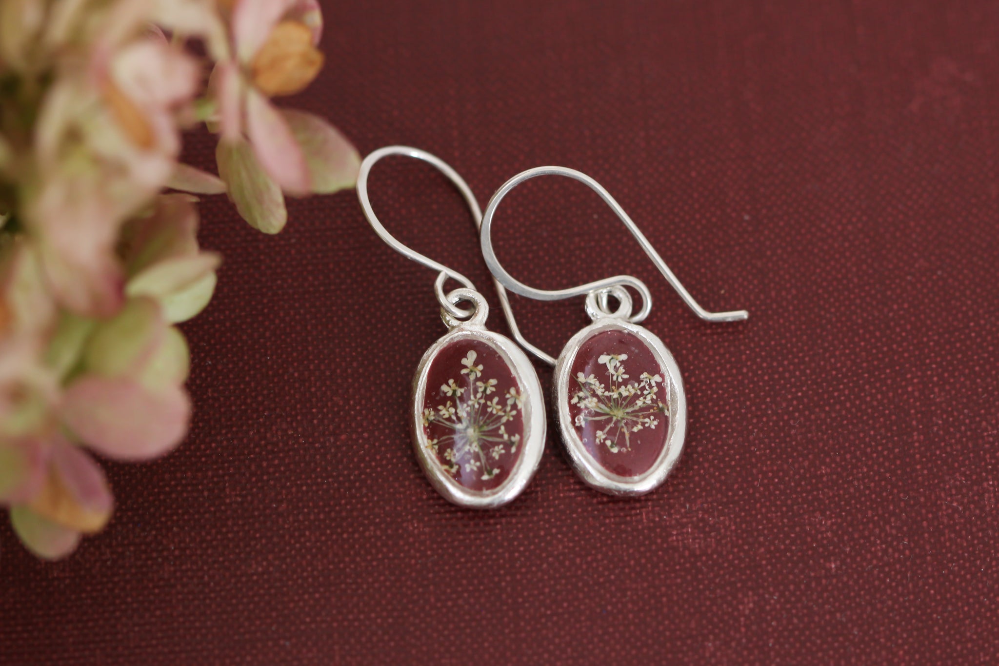 Elevate your elegance with these Burgundy Silver Oval Earrings, featuring delicate Queen Anne's Lace artfully preserved in resin and clay. Each pair is crafted with attention to detail and finished with handmade sterling silver ear wires, ensuring both luxury and lasting comfort. Perfect for adding a refined floral touch to any outfit.