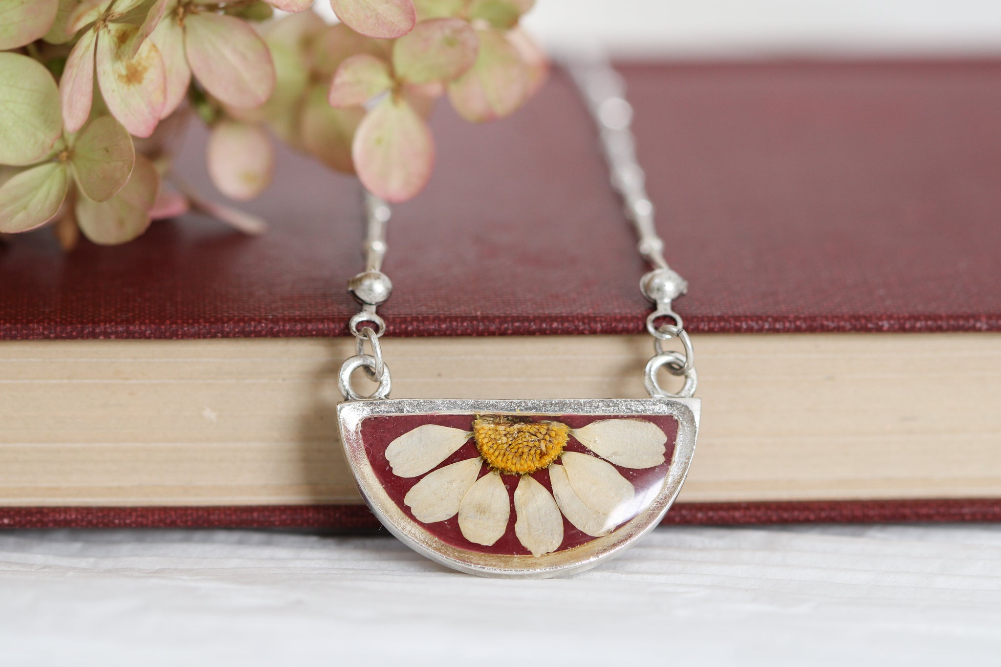 This Burgundy and Silver Flower Half Moon Necklace blends artistry with nature, featuring a half-moon shape crafted from resin and clay. Adorned with feverfew flowers locally harvested for a unique touch, each piece is delicately crafted from silver plated settings, on an 18" silver plated chain. Perfect for adding a sophisticated statement to any ensemble, this necklace celebrates craftsmanship and natural beauty in harmonious balance.