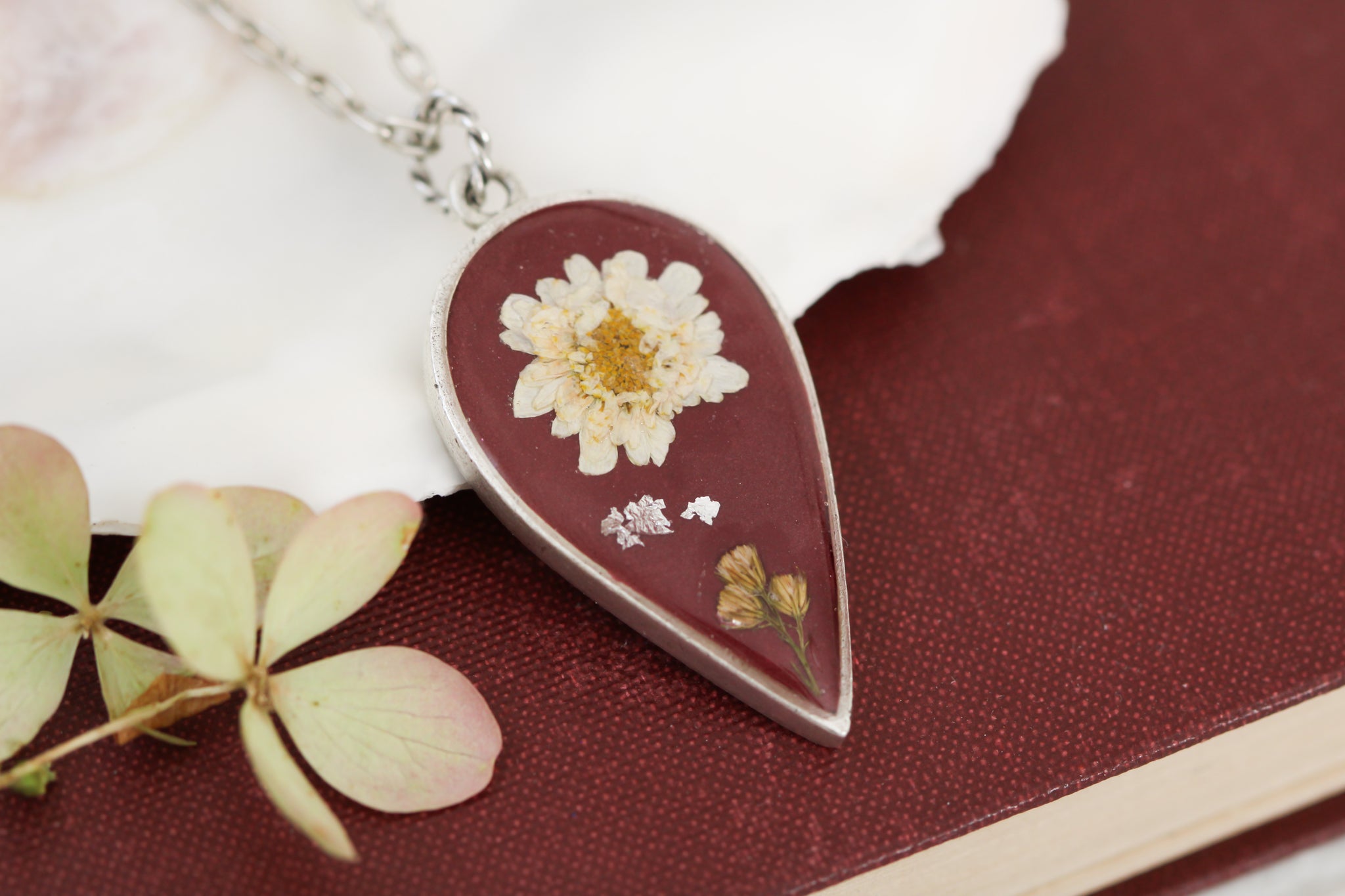Elevate your style with this sophisticated burgundy clay pendant, beautifully accented with resin-encased feverfew and solidago flowers. Set in a silver-plated statement frame and suspended from a 30" chain, this piece offers a unique blend of natural elegance and artisan craftsmanship, perfect for making a refined impression.