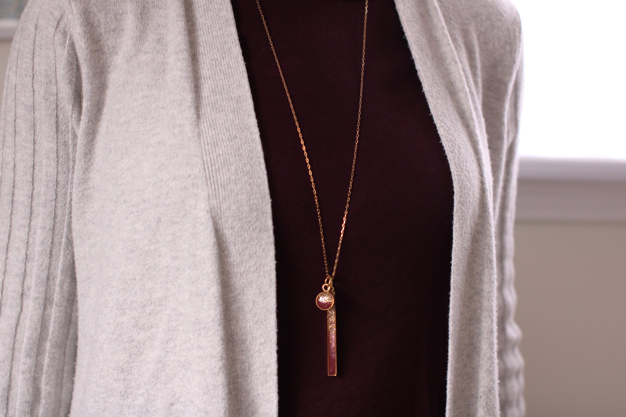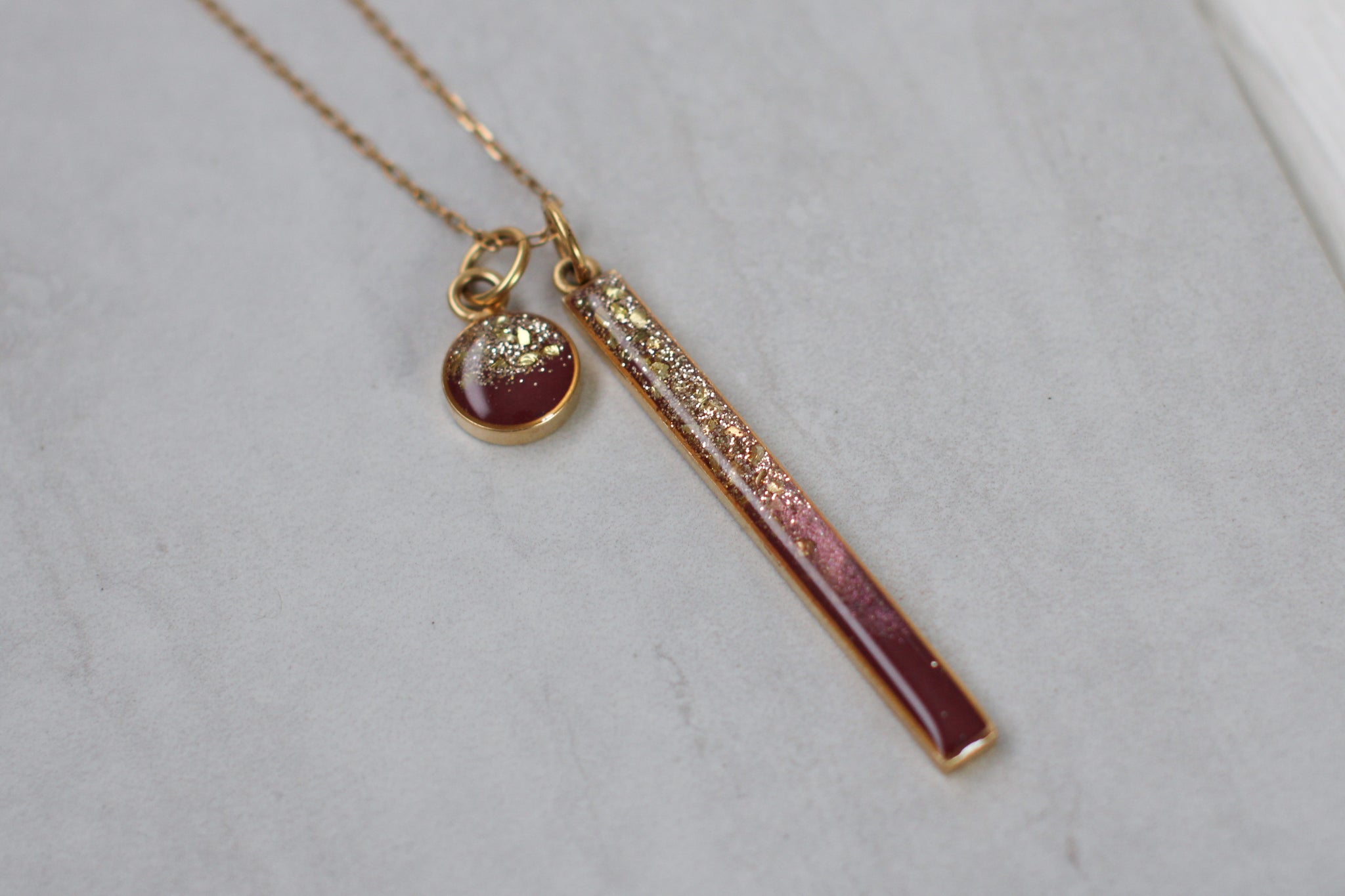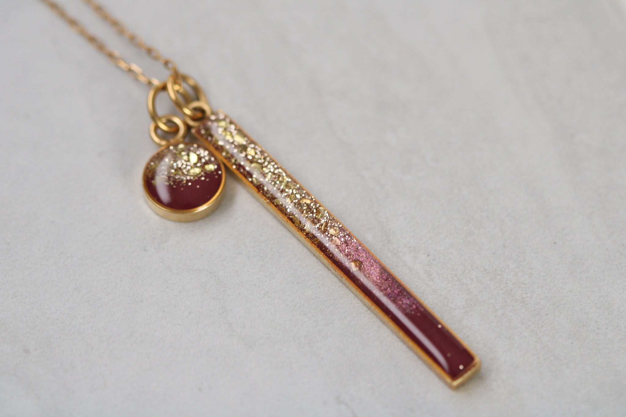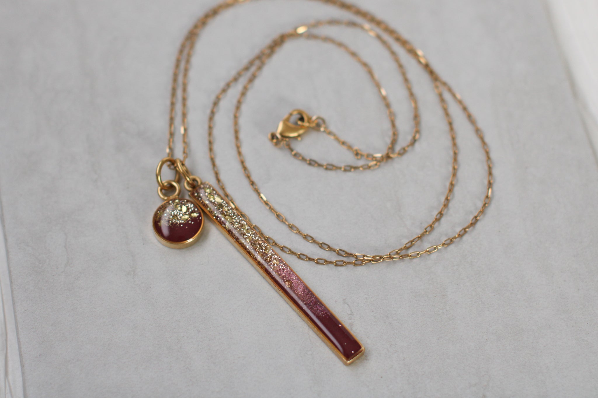 Brand new style to the website, this long style necklace is a gold  statement stunner!  Glittery and shimmery, this fun handmade necklace is made from epoxy clay, crushed glass, glitter, mica dust and resin.  All metals are gold plated.  Necklace chain measures 30 inches.
