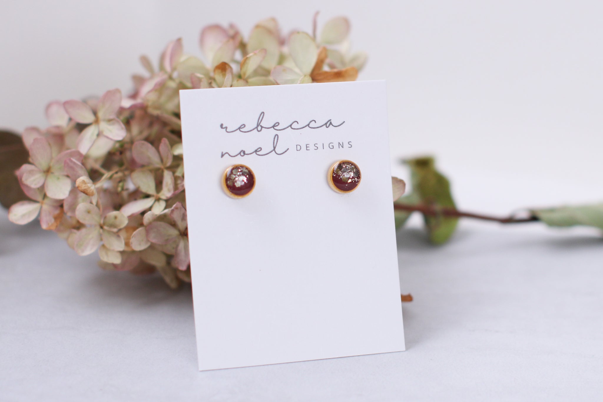 Cute, fun and still classy!  These small burgundy and gold stud earrings handcrafted from epoxy clay, glitter, and resin.  Posts are hypoallergenic stainless steel.
