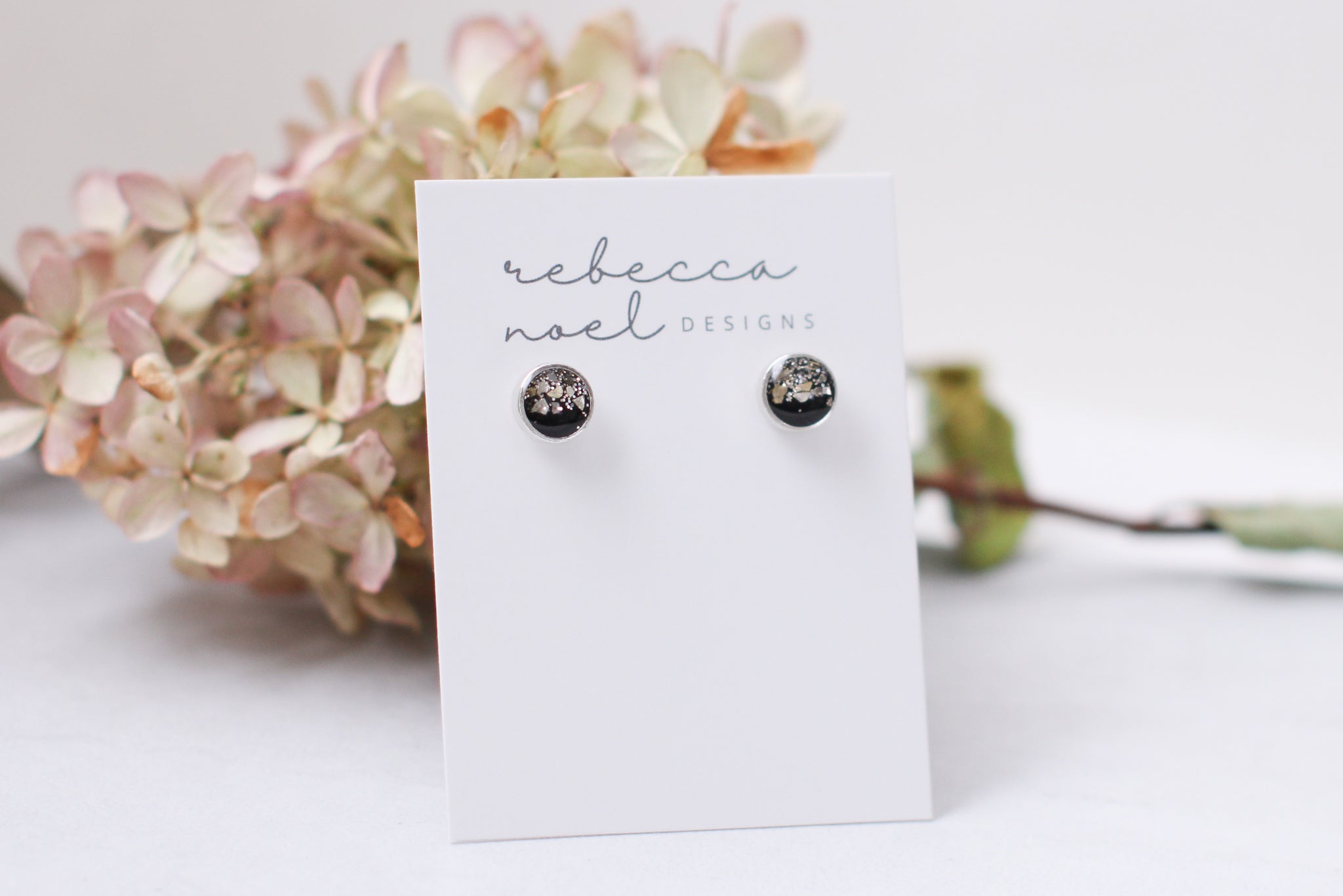 Cute, fun and still classy!  These small silver and black stud earrings handcrafted from epoxy clay, glitter, and resin.  Posts are hypoallergenic stainless steel.