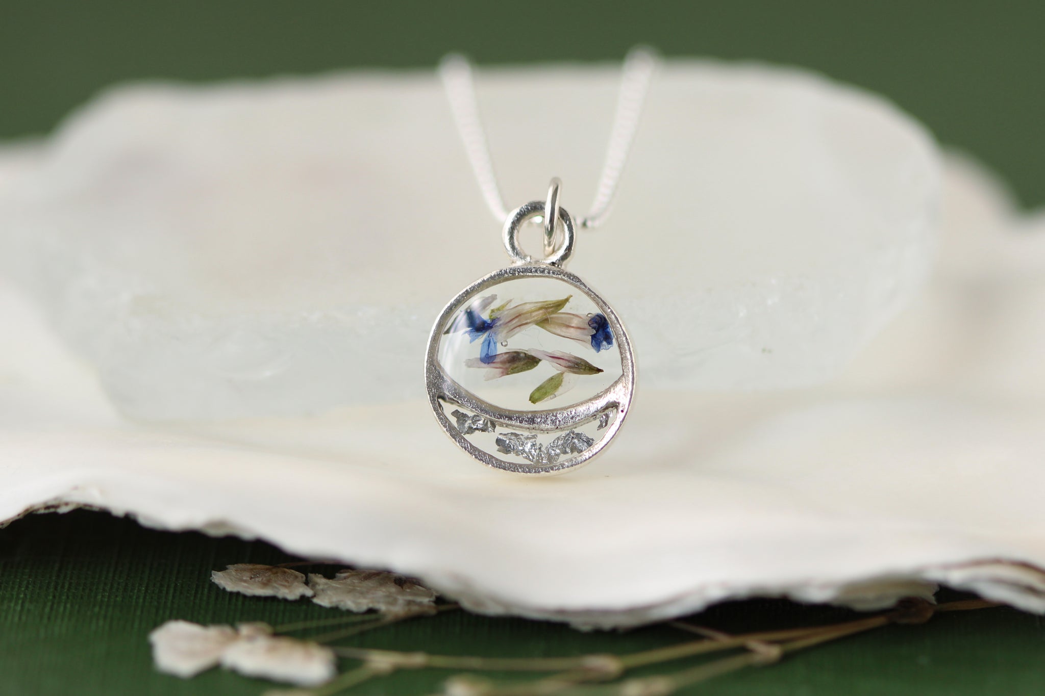 A fun shape, this split circle charm features dried limonium flowers in the top, and silver leaf (gilding flakes) in the bottom section. So dainty! The charm hangs on an 18” sterling silver chain.